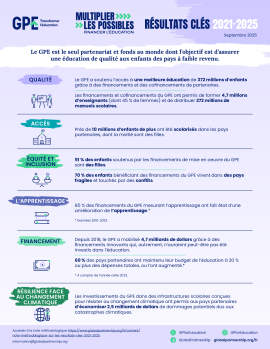 Au cours des 5 années du plan stratégique GPE 2025, le partenariat a atteint des résultats impressionnants en matière d'accès, d'équité et d'inclusion, de qualité de l'enseignement, d'apprentissage, de résilience face au changement climatique et de financement. Cette fiche d'information détailles les résultats clés dans chacun de ces thèmes.